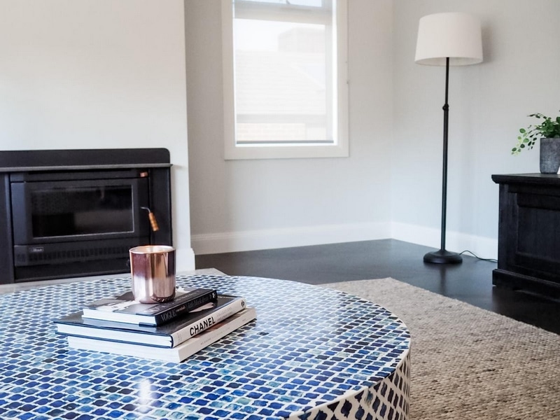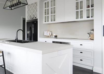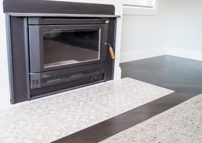 We worked closely with these clients to achieve a spacious split-level custom home on a sloping block. Inspired by both the Hamptons and farmhouse styles, Story House features dark-stained chevron flooring, 3.4 metre ceilings, French doors and ornate skirting and architraves. Other features include a striking VELUX skylight, herringbone tiles in the ensuite, a unique stone splashback in the kitchen and a classic log fireplace in the L-shaped living area.